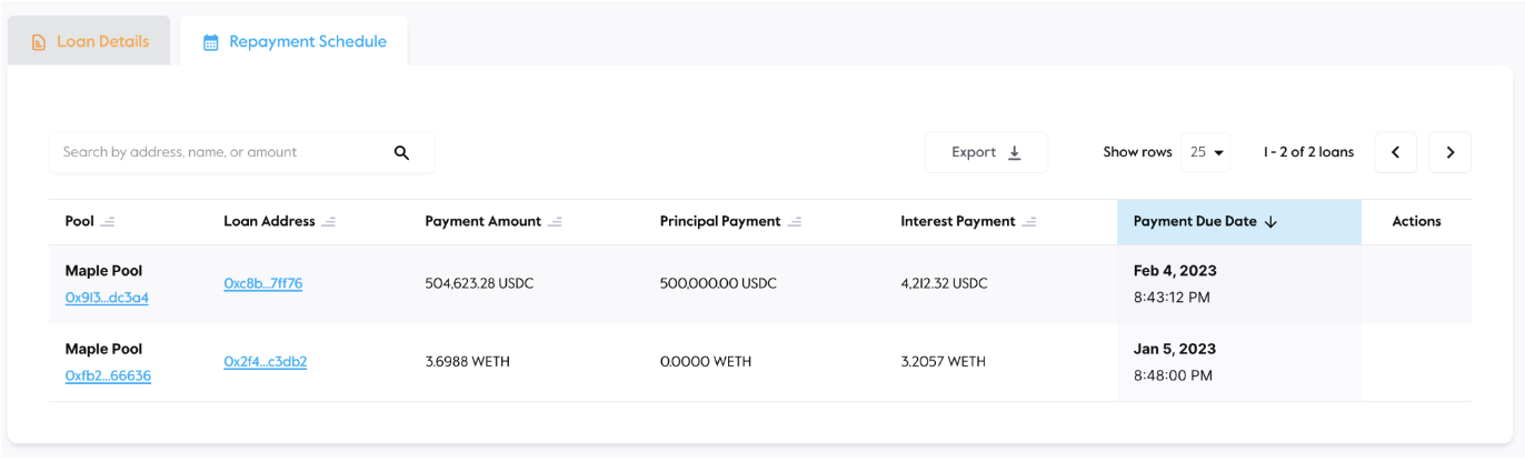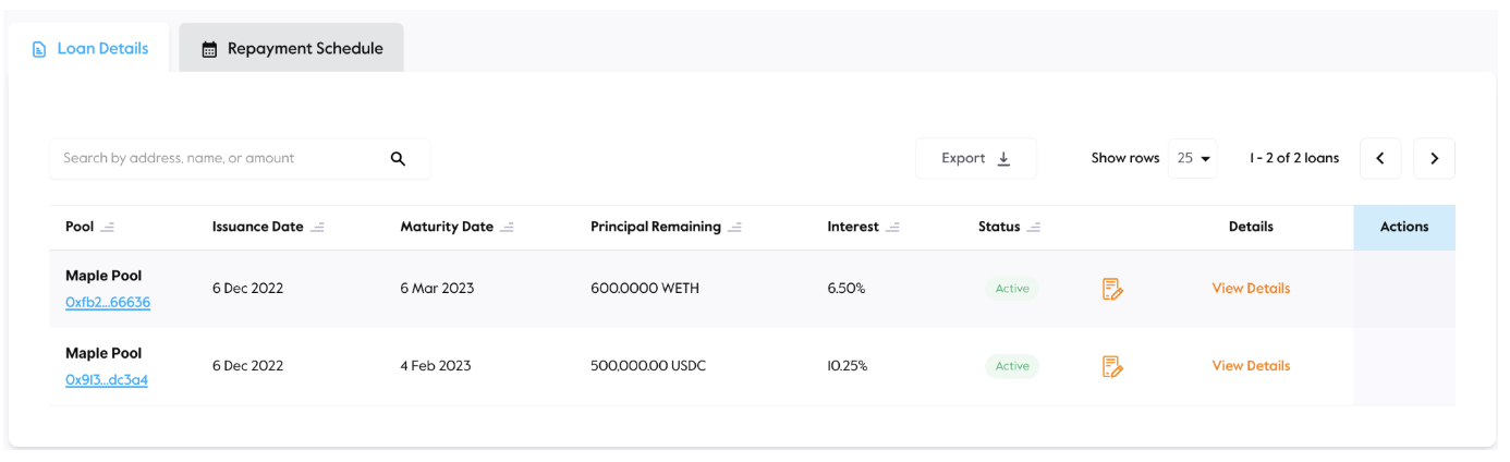 5\. Borrowers will return to the WebApp to make their interest repayments on a recurring basis and view the details of their loans on Maple. The final payment at the end of the loan term will prompt repayment of the principal balance.