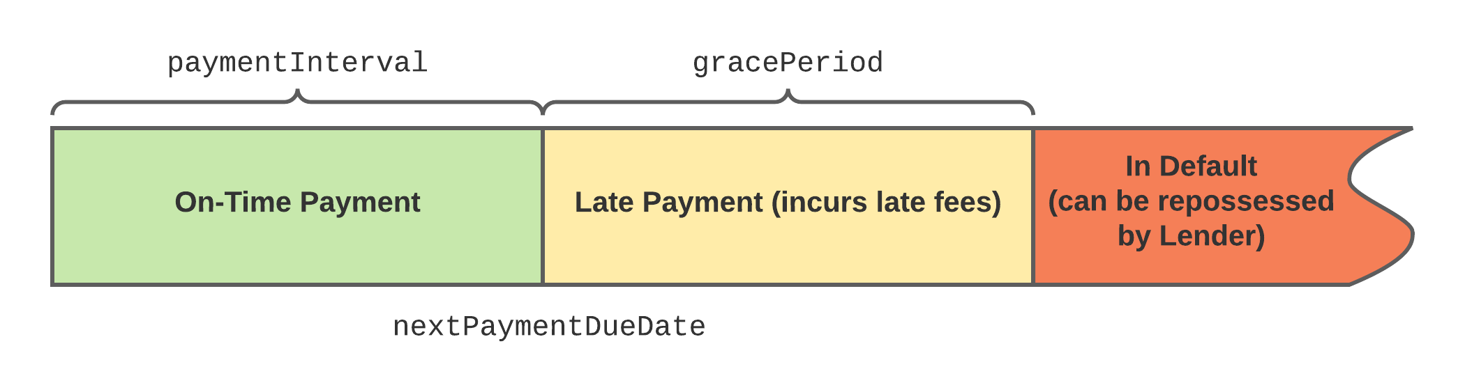Every Loan has a defined payment interval which determines when payments are expected to be made by the Borrower. If the Borrower does not make a payment before the expected due date, there is a grace period during which they can make a late payment. After the grace period passes the loan is considered to be in default, and the Pool Delegate has the option to repossess the Loan and begin the liquidation process by calling triggerDefault().